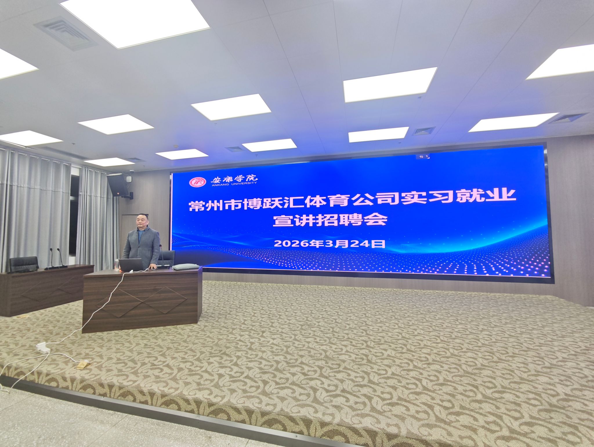 3月24日晚,常州博跃汇体育文化产业发展有限公司董事长巢旭、相关负责人黄明君一行莅临我院,面向大三、大四年级学生举办实习就业专场宣讲会。pa视讯娱乐游戏平台领导班子成员、全体辅导员和全体大三、大四同学共同参加了此次活动。