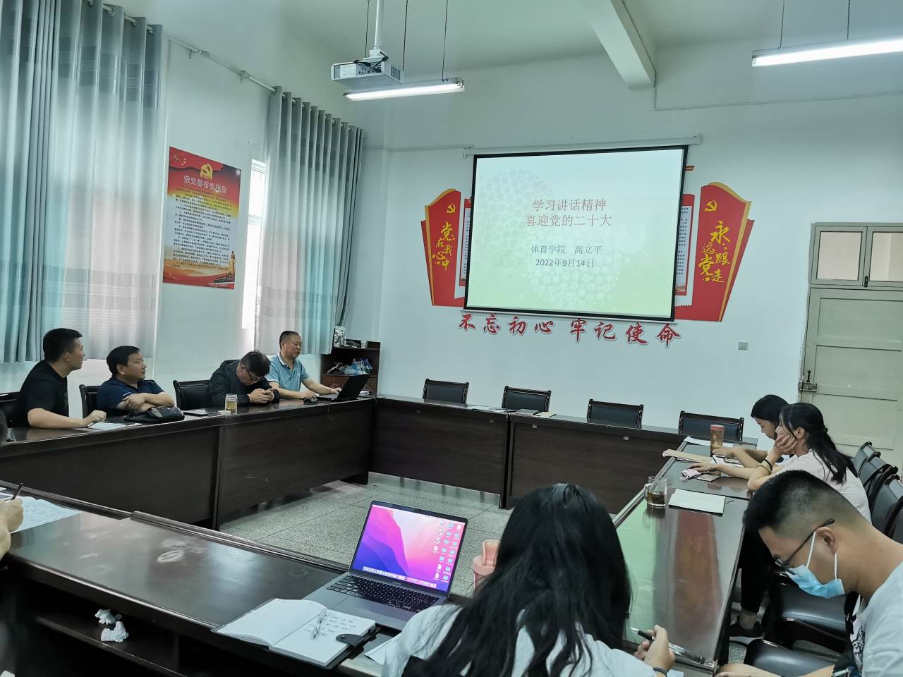 9月14日下午,pa视讯娱乐游戏平台党总支书记高立平以“学习讲话精神,喜迎党的二十大”为题,为我院全体党员上专题党课。全体党员参加会议。