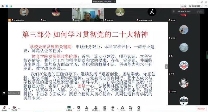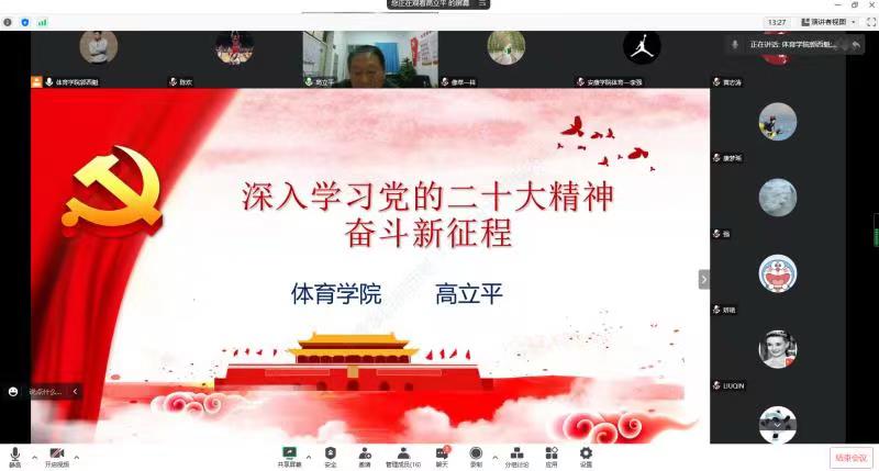 本次工会活动运用“腾讯会议”软件以线上形式开展,邀请pa视讯娱乐游戏平台党总支书记高立平同志为pa视讯娱乐游戏平台全体教师作了题为《深入学习党的二十大精神—奋斗新征程》的主题报告,从党的二十大召开概况;党的二十大的主要精神和如何贯彻党的二十大精神等三个方面进行了宣讲。