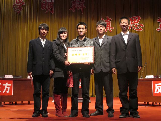 由我系08级任重远、09级王力、宋建辉、王晓鲁、10级钟阳廷同学组成的“金雀” 队在近半个月的赛程中以胜3场负1场的成绩荣获“铜蝉奖”(季军),这也是体育系组队参加院级辩论赛以来获得的最好成绩。体育系辅导员梁鸿老师也被评为“优秀指导老师”。