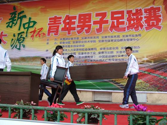 2012年11月1日,由安康市体育局、共青团安康市委等单位主办,我校承办的安康市喜迎十八大新中源杯青年男子足球赛在江南校区足球场隆重开幕。来自安康市各县区、事企业单位的十四支足球队济济一堂,相聚在pa视讯集团足球场,充分展现出团结进取、蓬勃向上的安康青年精神风貌,以满腔的热情喜迎“十八大”的召开。安康市人大常委会副主任吴应德、安康市政协副主席徐铁军、pa视讯集团党委副书记胡鸿晓等领导出席了开幕式。安康团市委副书记梁鸿主持开幕式。