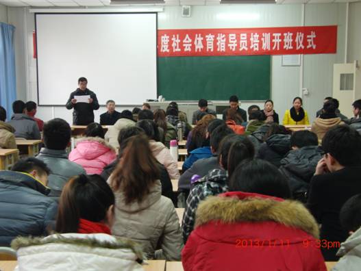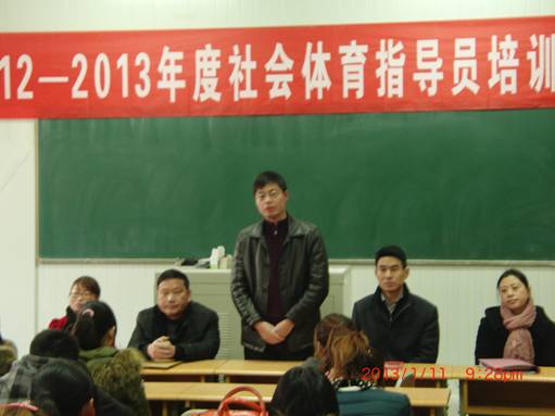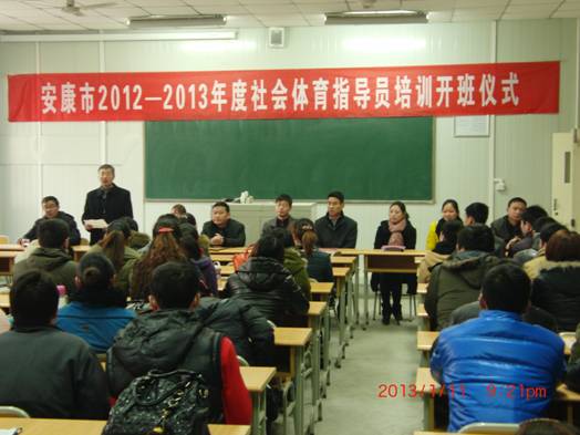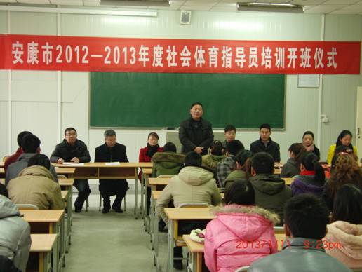 2013年1月12日上午9:00,安康市2012-2013年度社会体育指导员培训班开班典礼在我校举行。安康市体育局党组成员、纪检组长陈复勇、安康团市委副书记梁鸿、安康市体育局群体科科长朱小燕、pa视讯集团体育系主任冯德学、pa视讯集团体育系副主任鲁宗成等领导以及部分授课教师和全体学员共一百余人参加了开班典礼,典礼仪式由pa视讯集团体育系党总支书记沈军主持。