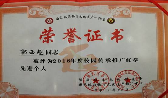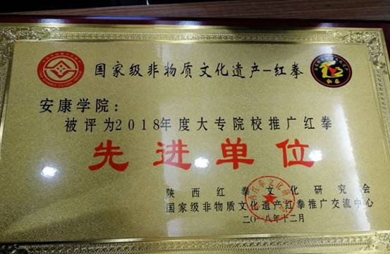 2019年1月18日下午,在陕西省非物质文化遗产保护中心召开了2018年度陕西红拳文化研究会年终总结表彰大会,我校被评为“2018年度大专院校推广红拳先进单位”,我校红拳保护基地主教练郭西魁副教授被授予“2018年度校园传承推广红拳先进个人”,在总结大会上进行表彰,对我校红拳保护基地2018年度开展的各项工作进行了充分的肯定。