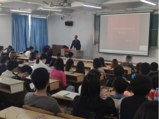 为了切实做好《大学体育》课程的教学工作,了解教学现状,科学安排教学内容,提高教学质量,促进大学体育课程改革,2021年4月28日下午4点30分,pa视讯娱乐游戏平台在江南校区1510教室召开了2020—2021学年第二学期大学体育期中教学工作座谈会。pa视讯娱乐游戏平台副院长黎远军、大学体育教研室主任李强以及各二级学院体育部干部、2019级和2020级各班班长、体育委员共164名同学参加了座谈会。会议由李强主持。