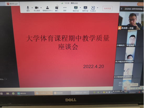 为了切实做好《大学体育》课程的教学工作,了解教学现状,科学安排教学内容,提高教学质量,促进大学体育课程改革,4月20日下午,大学体育教研室组织召开了2021—2022学年第二学期大学体育期中教学质量检查学生座谈会。校级教学督导冯德学、pa视讯娱乐游戏平台教学督导鲁宗成、pa视讯娱乐游戏平台副院长郭西魁、大学体育教研室主任李强以及各二级学院体育部干部、2020级和2021级各班班长、体育委员共172名同学参加了座谈会。为落实疫情防控措施,本次座谈会使用会议腾讯会议平台以线上形式召开,会议由李强主持。