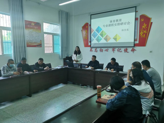 首先,体育系主任李靖宣布了下学期教学任务下达情况,通过教学任务分析目前课程安排存在的问题,阐述实际排课中选择两个专项带来的课程时间段不够、理论课和部分的技术课安排在周内晚上和周六的困难。经过教研室成员热烈的讨论,一致认为:2022级从人才培养方案着手,优化选项课程设置,而2020级与2021级的课程安排采取打破传统的自然班授课,根据专项课的不同,理论课三时段任选一时段交叉上课。
