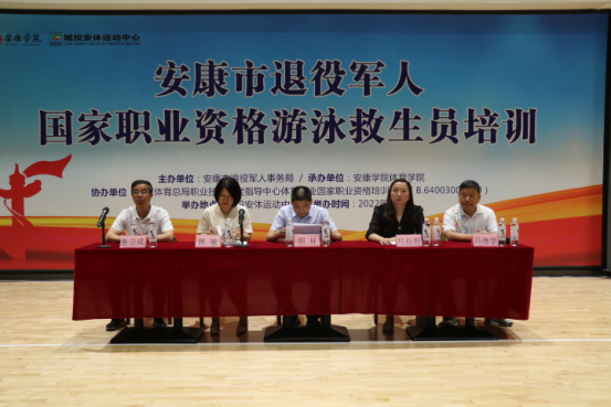 6月13日下午,安康市退役军人国家职业资格游泳救生员培训班开班仪式在城投安康运动中心一楼羽毛球馆举行,安康市退役军人事务局副局长胡林,pa视讯娱乐游戏平台院长吕仙利,项目负责人冯德学,国家职业资格游泳救生员培训师鲁宗成参加了开班仪式。