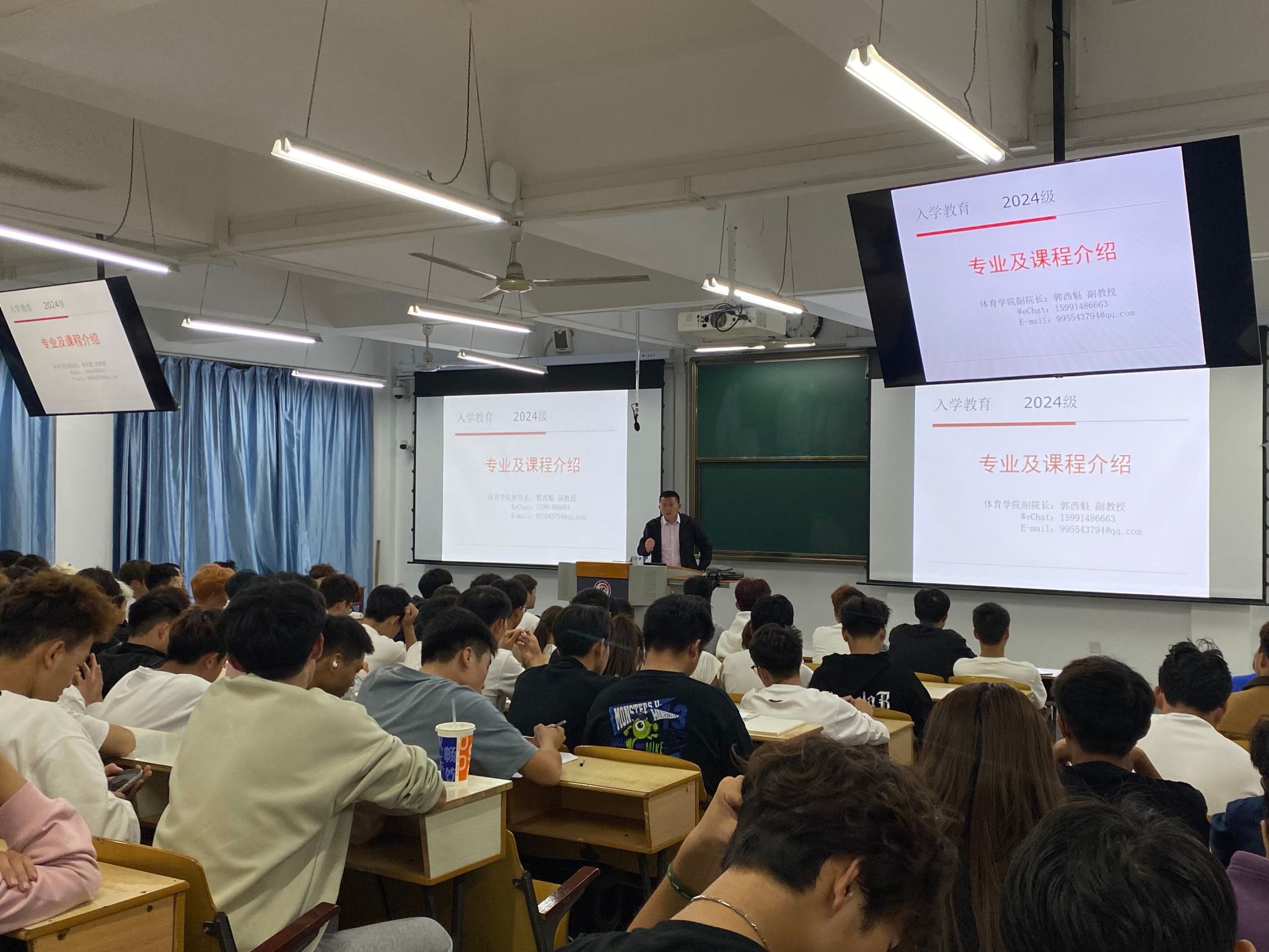 2024年10月15日晚7点,pa视讯娱乐游戏平台教学副院长郭西魁在1510教室为2024级全体新生开展入学教育课,郭院长对体育教育专业做了具体而生动的介绍,包括专业教学特色、主要课程与特点、毕业条件及职业描述、职业成长及典型工作任务、专业人才培养方案、学院及专业教学资源,并以自身求学经历为例勉励广大新生要以梦为马,不负韶华,争做有价值的时代新人。在讲座的结束时,郭院长为现场同学耐心答疑解惑。