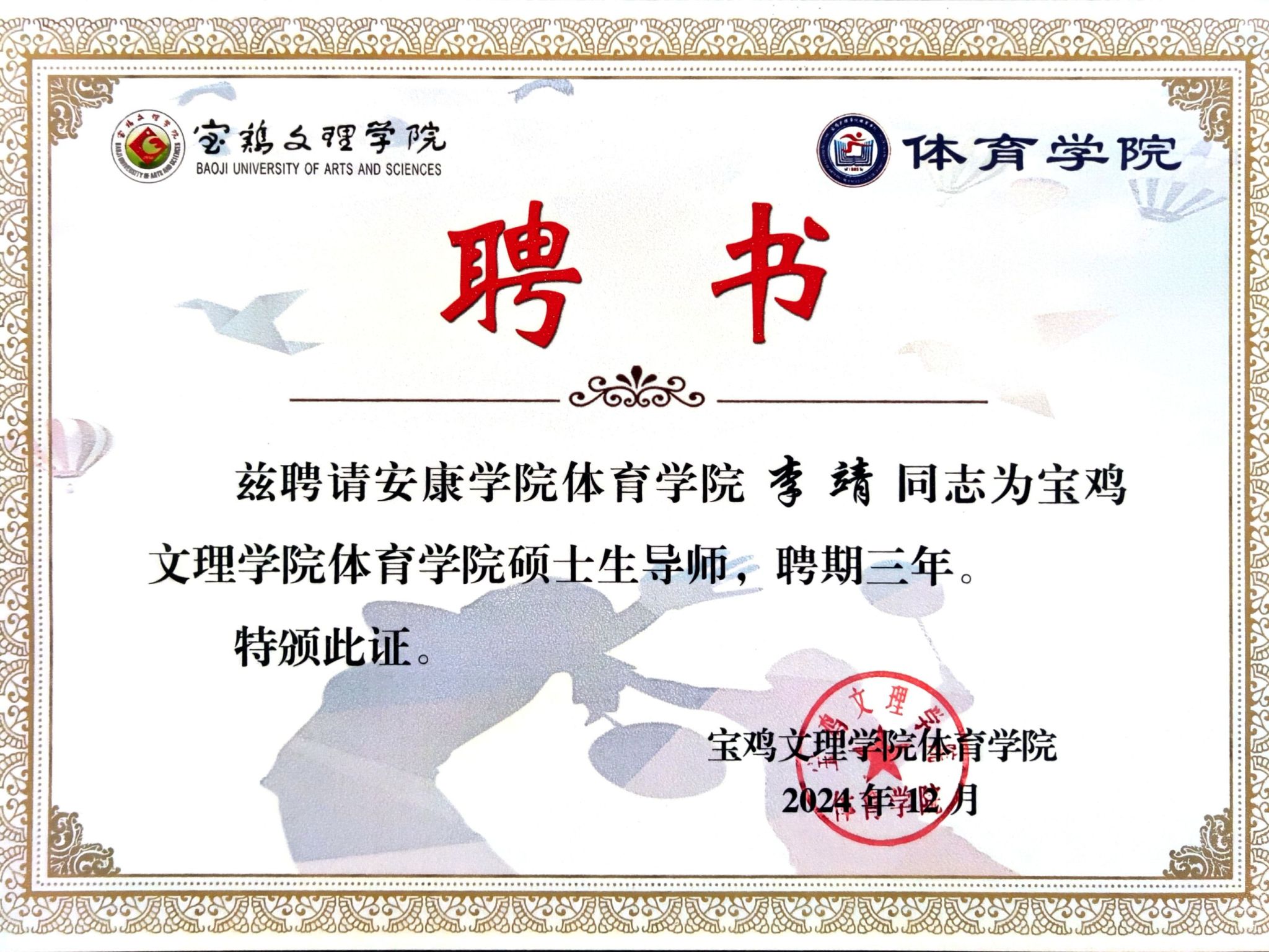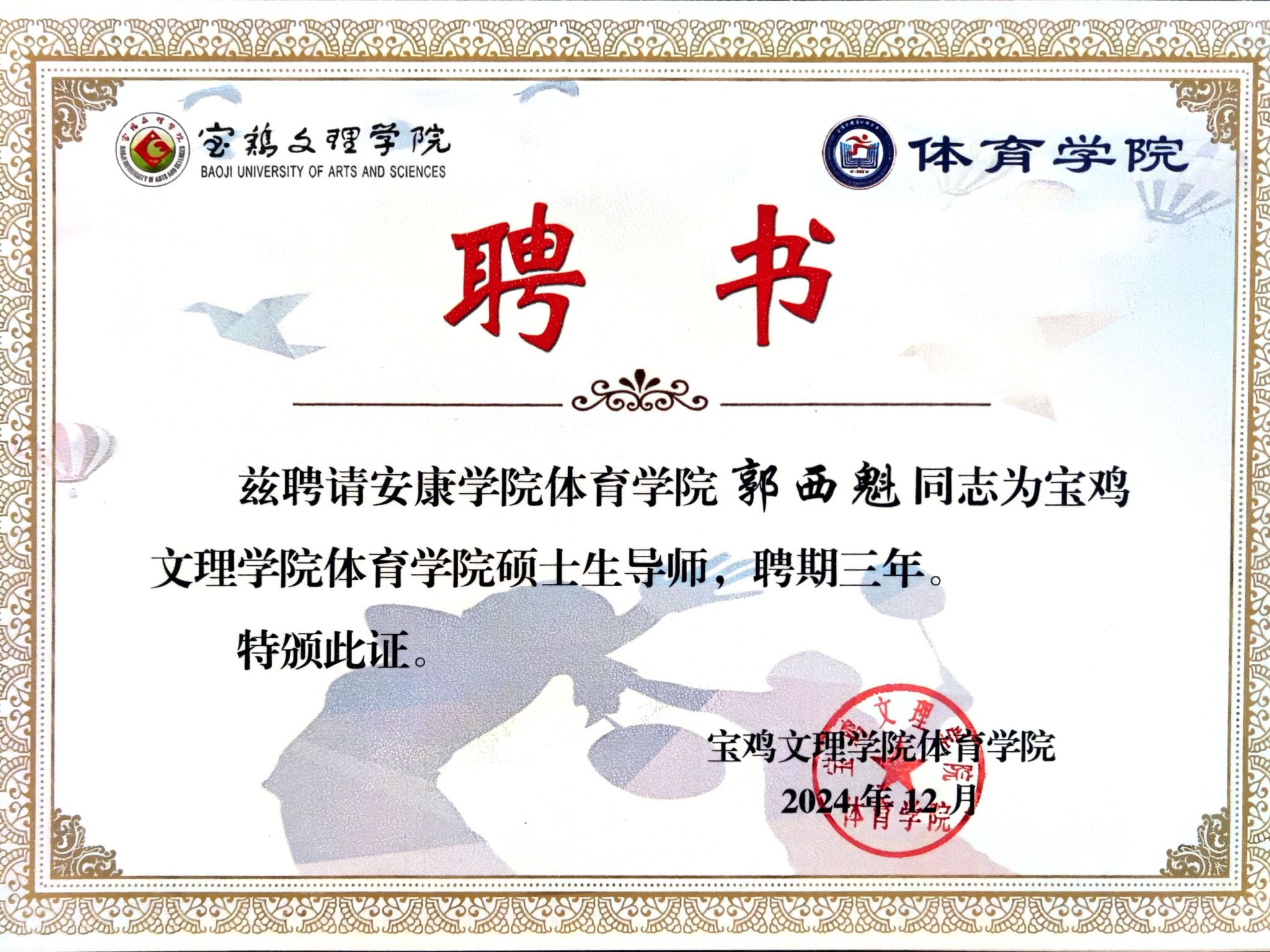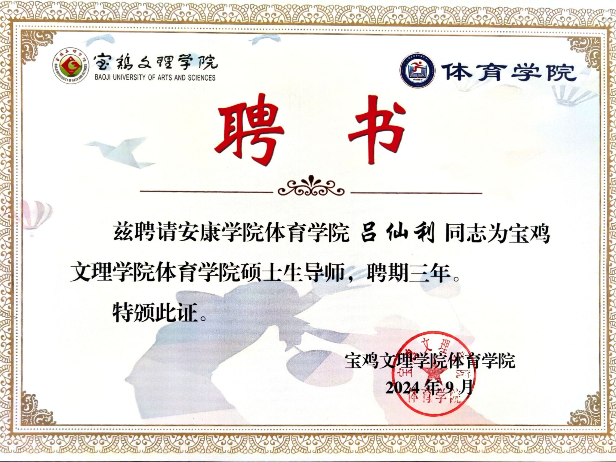 宝鸡文理学院pa视讯娱乐游戏平台严格按照专业硕士学位教育的要求,经过层层遴选,决定聘任我院吕仙利、郭西魁、李靖三位老师为宝鸡文理学院pa视讯娱乐游戏平台硕士专业学位研究生指导教师。本次聘任工作不仅是宝鸡文理学院pa视讯娱乐游戏平台对我院教学师资力量的肯定,同时也将为我院培养一批具有硕士研究生培养经验的人才,为进一步促进我院体育教学、科研工作水平的提高和申报专业硕士点奠定了重要基础。
