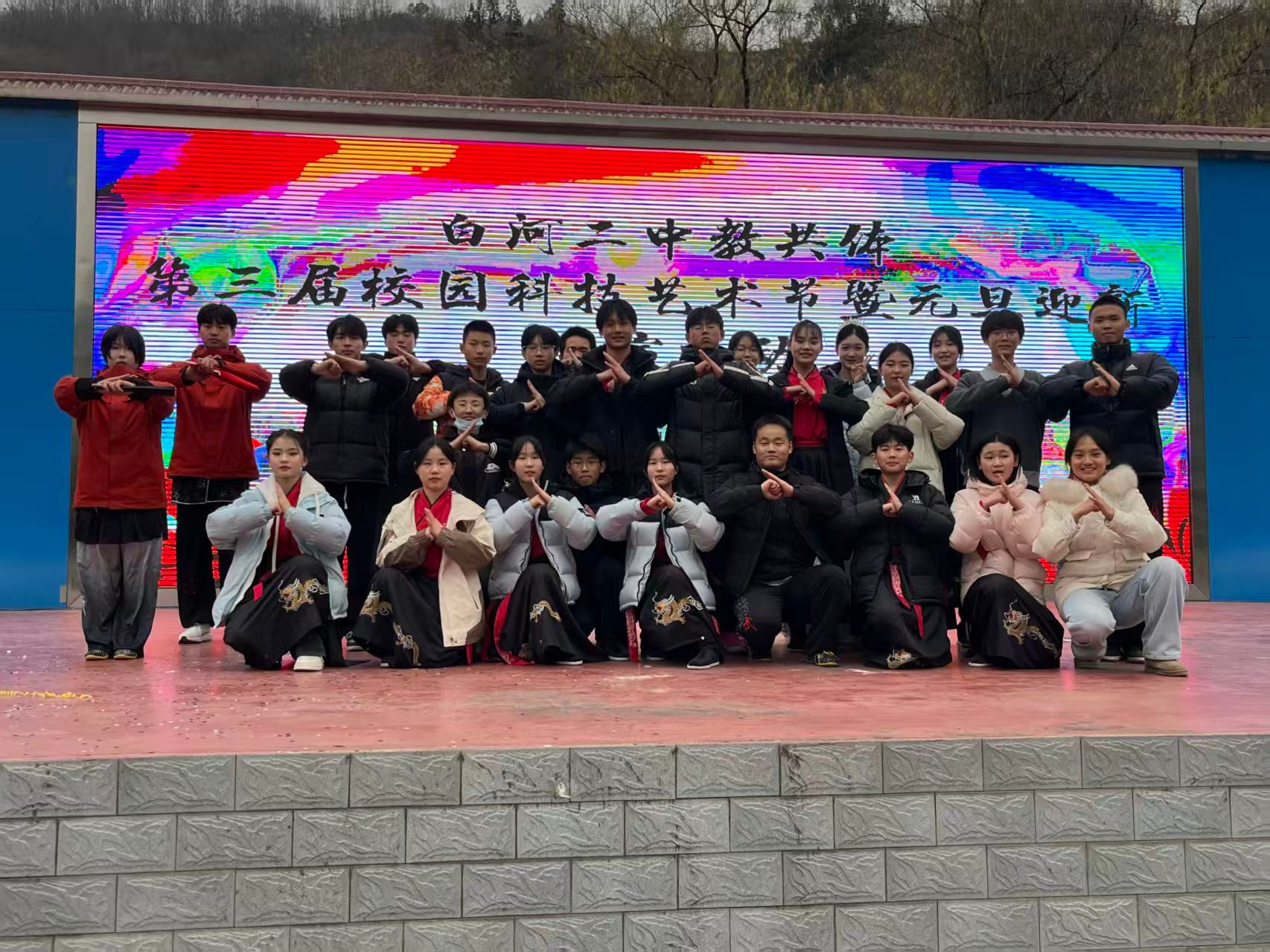 近日,白河县第二中学教共体第三届校园科技艺术节暨元旦迎新汇演热烈启幕。pa视讯娱乐游戏平台武术队携狮子、彩带龙与白河二中学子联合呈现的节目《尚德健体,武绽芳华》震撼登场,以传统民俗与武术精神的碰撞,为现场师生带来一场兼具文化底蕴与青春活力的视觉盛宴。