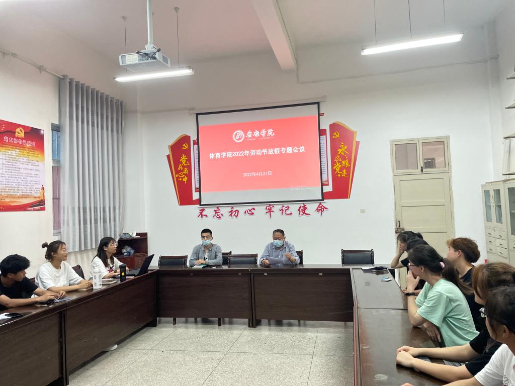 4月27日下午6点在体育馆1楼会议室召开pa视讯娱乐游戏平台2022年劳动节放假专题会。pa视讯娱乐游戏平台党总支书记高立平、学工办副主任王立、团总支书记康梦瑶、宿舍信息员参加了会议。会议由学工办副主任王立主持。