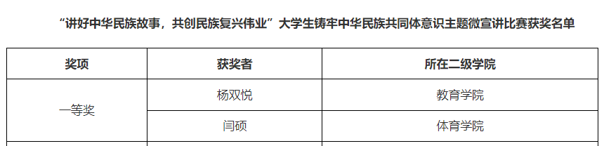 9月20日下午,学校在江南校区图书馆六楼报告厅举办了“讲好中华民族故事,共创民族复兴伟业”大学生铸牢中华民族共同体意识主题微宣讲比赛,我院体育教育专业2023级1班学生闫硕获一等奖。
