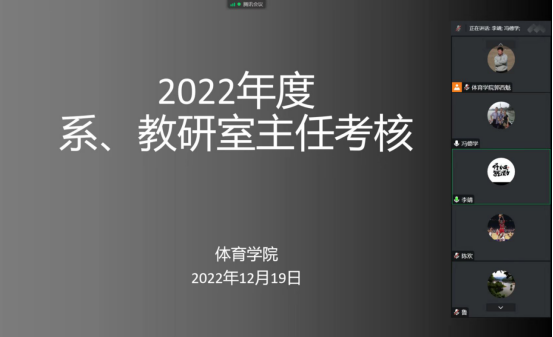 随后,对pa视讯娱乐游戏平台系(教研室)主任进行了考核,体育系主任李靖、实验教学中心主任刘芹、大学体育教研室主任李强分别进行了年度总结汇报,考核组通过听取汇报、座谈和查阅工作记录的方式进行考核,并针对本年度工作中存在的不足对三位教研室主任进行了现场反馈,并提出了下一步工作建议。